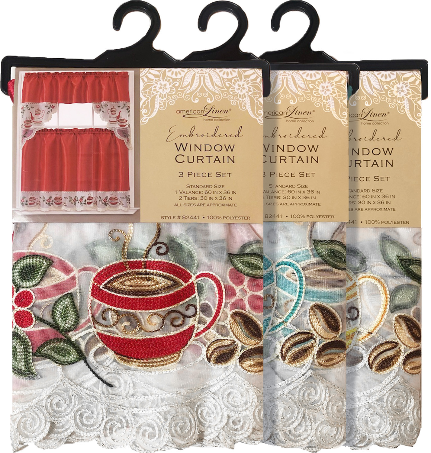 100% Polyester 3 piece embroidered window curtain set. Includes one valance approximately 60" x 36" and two tiers each 30" x 36". Coffee Cup design in an assortment of colors.