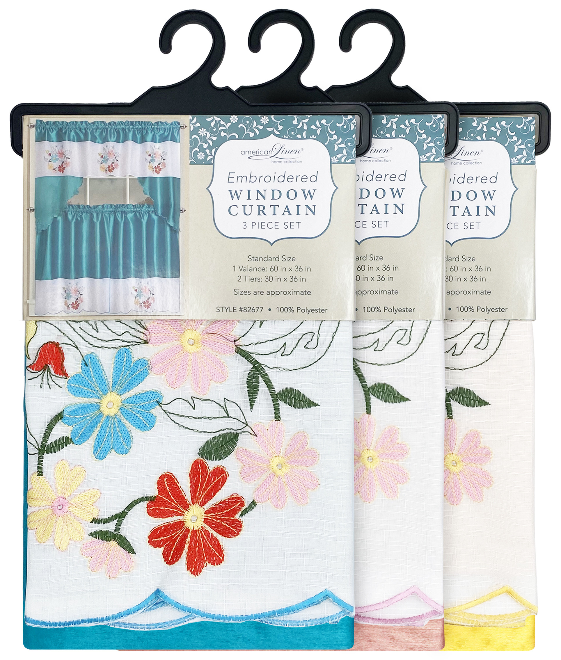 Three piece window curtain set with floral embroidery. Includes one valance approximately 60" x 36" and two tiers each 30" x 36". Comes in assorted colors as shown.