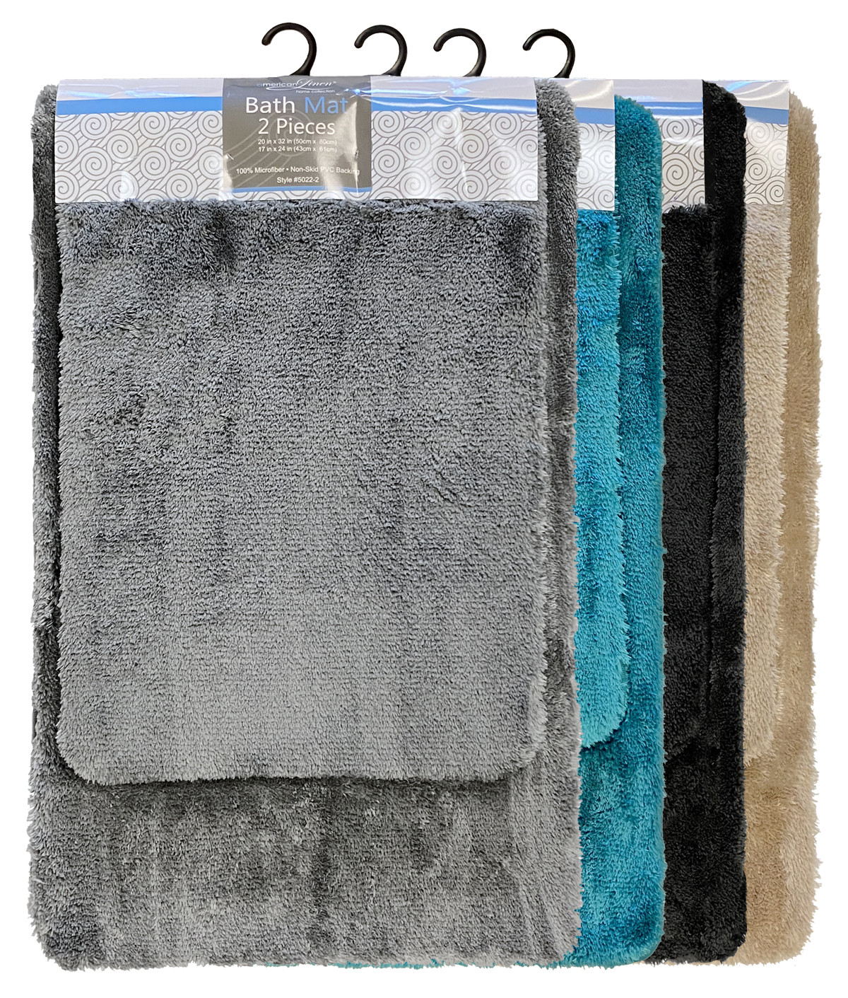 2 piece plush bath mat set with foam center and non skid backing. Small mat measures 17" x 24" & large mat measures 20" x 32". Assorted colors.