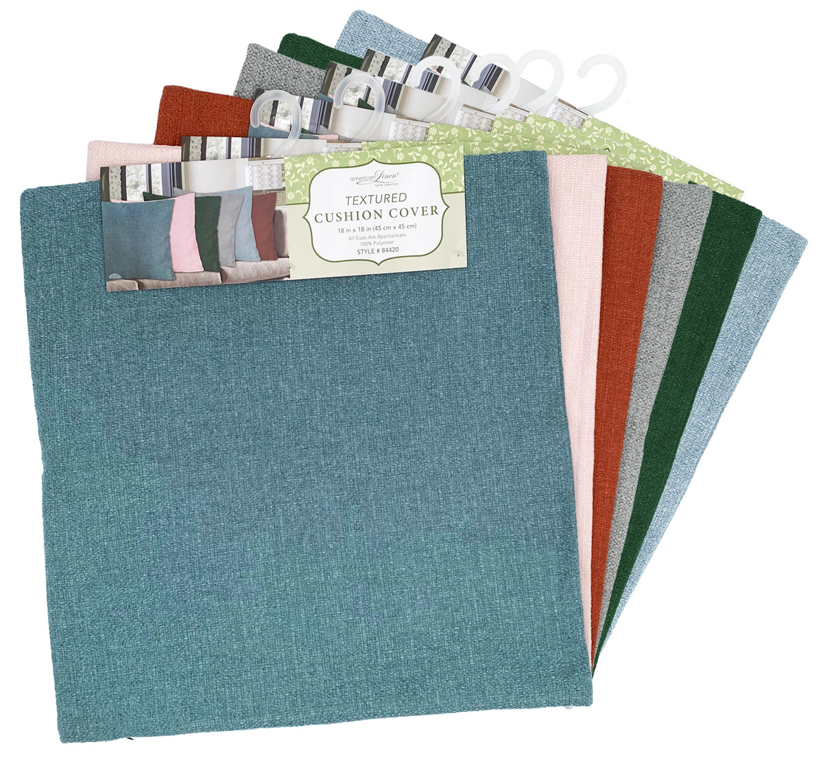 100% Polyester cushion covers with zipper opening and textured fabric. Measures 18" x 18". Double-sided. Comes in assorted colors.