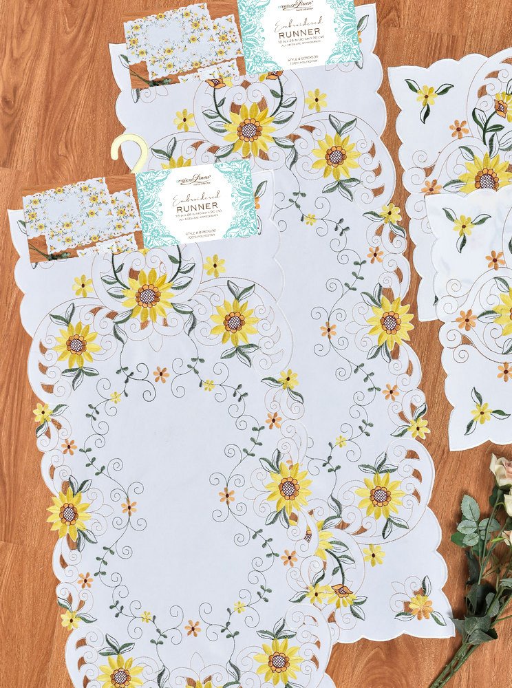 100% Polyester embroidered and cut-work table runner with sunflower design. Design as shown. Measures 16" x 54".