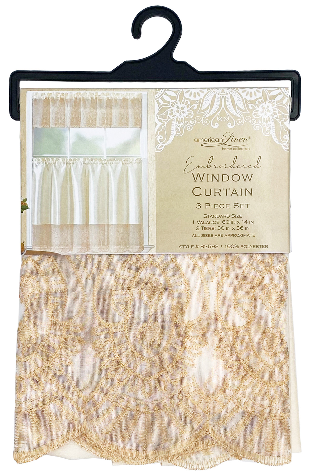 100% Polyester 3 piece window curtain set with embroidered lace. Includes one valance approximately 60" x 36" and two tiers each 30" x 36". Comes as shown.