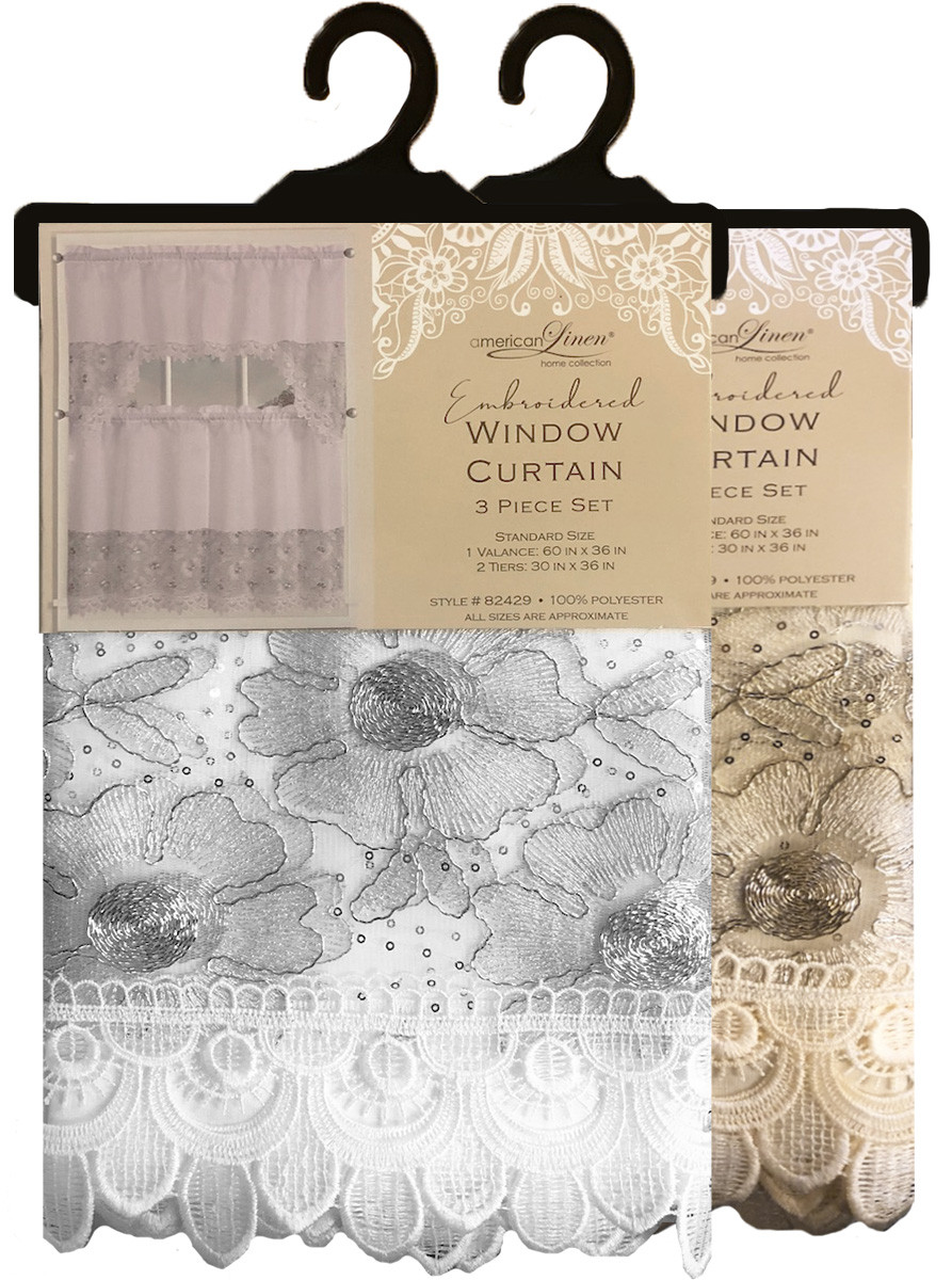 100% Polyester 3 piece lace window curtain set that comes with sequins. Includes one valance approximately 60" x 36" and two tiers each 30" x 36". Available in beige.