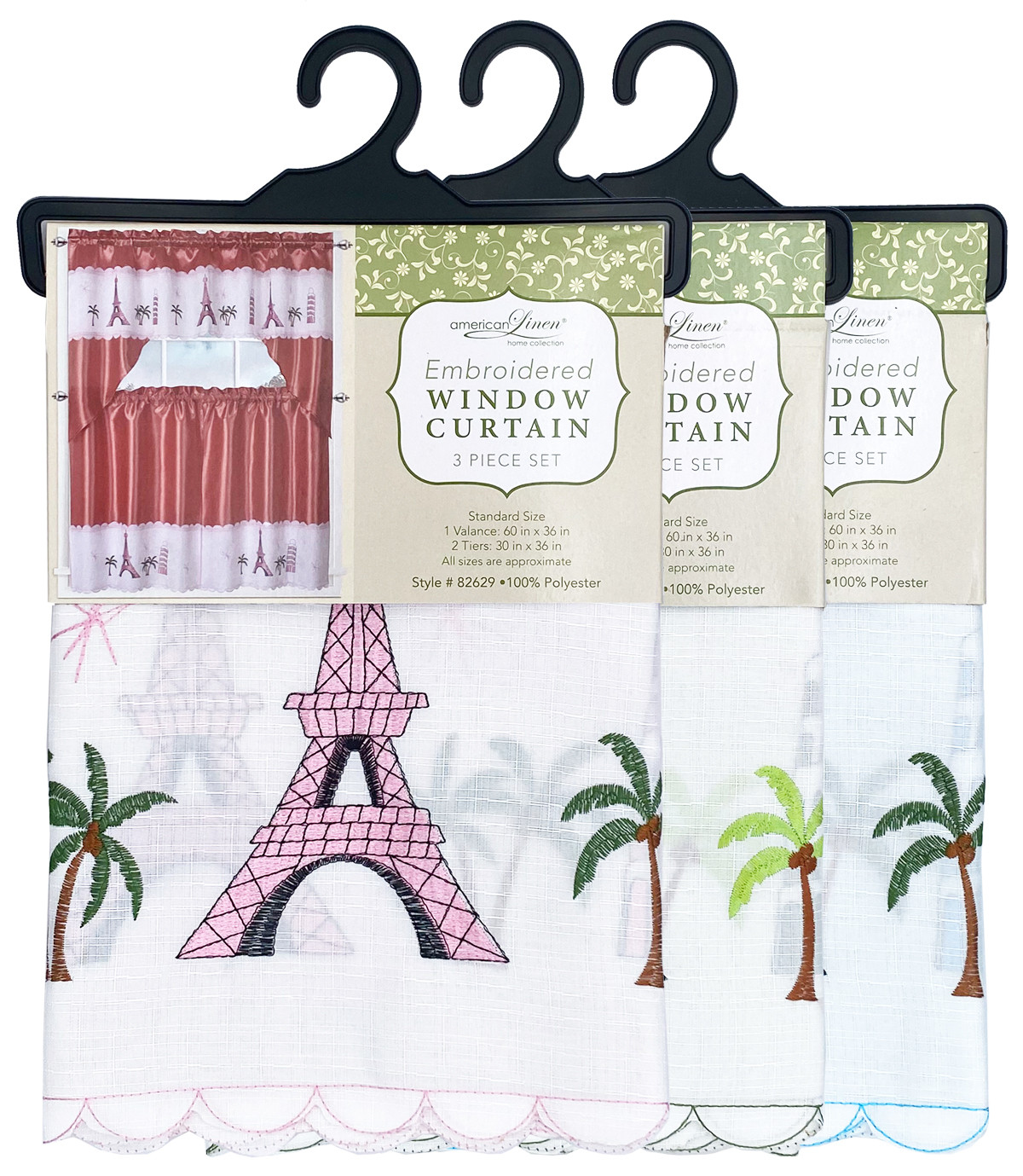 100% Polyester 3 Piece Embroidered window curtain set with Eiffel Tower pattern. Includes one valance approximately 60" x 36" and two tiers each 30" x 36". Comes in assorted colors as shown.